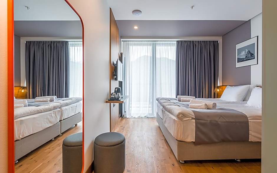 The spacious double room offers soundproof walls, a seating area, a balcony with mountain views as well as a private bathroom boasting a bath.